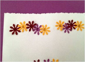 Zum Schluss habe ich die bunten Blumen noch einmal ausgestanzt und diese oben auf der Karte fest geklebt. Auf jeder Blume steht ein Buchstabe, sodass auf der Karte „Alles Gute“ steht.