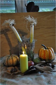 Die Lauchstangen werden so ins Glas gestellt, dass die Punkerfrisur (Wurzeln) oben sind und das Glas nach Lust und Laune dekoriert. Ins Glas können Sand oder Steine gegeben werden, über den Rand lässt sich Stroh oder Heu gut verteilen. Ums Glas wird ein Band gebunden und fertig ist die Tischdekoration.