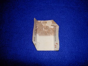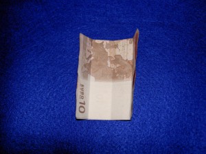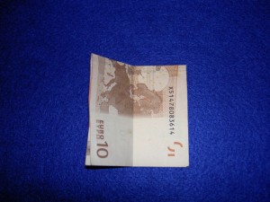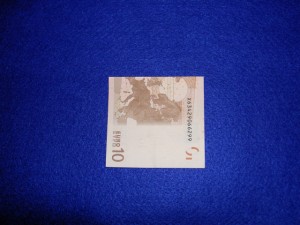 Drehe den Geldschein auf die andere Seite, so dass die glatte Seite oben liegt.