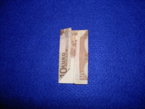 Du kannst Dir ein stumpfes Messer mit breiter Klinge (Fisch- oder Buttermesser) zur Hilfe nehmen, die Tasche im Geldschein etwas anheben und dann unten am Messer entlang die Geldscheinspitze in die Tasche gleiten lassen.