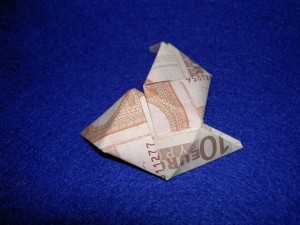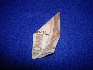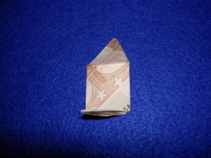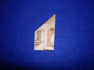 Dann stecke den dritten Geldschein in die gegenüberliegende Tasche des zweiten Geldscheins, dann hast Du schon eine Ecke fertig.