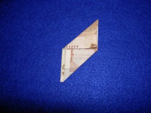 Falte dann die obere Spitze zur rechten Kante und achte darauf dass die Spitze auf der unteren rechten Ecke zu liegen kommt.
