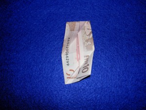 Dann falte die obere Kante genau auf die untere Kante, so dass der Geldschein in der Länge halbiert ist.